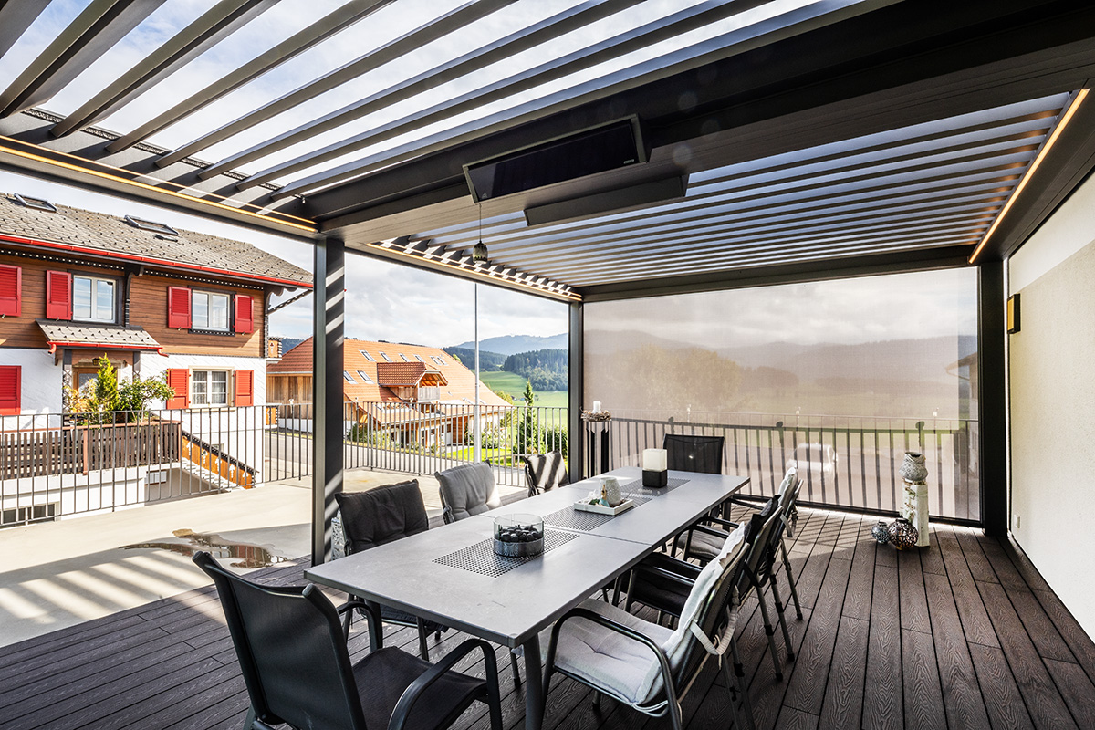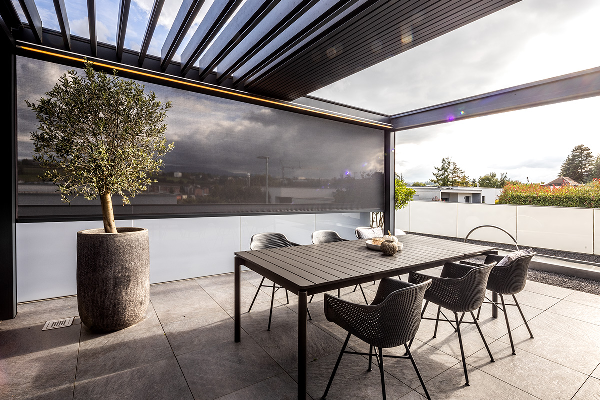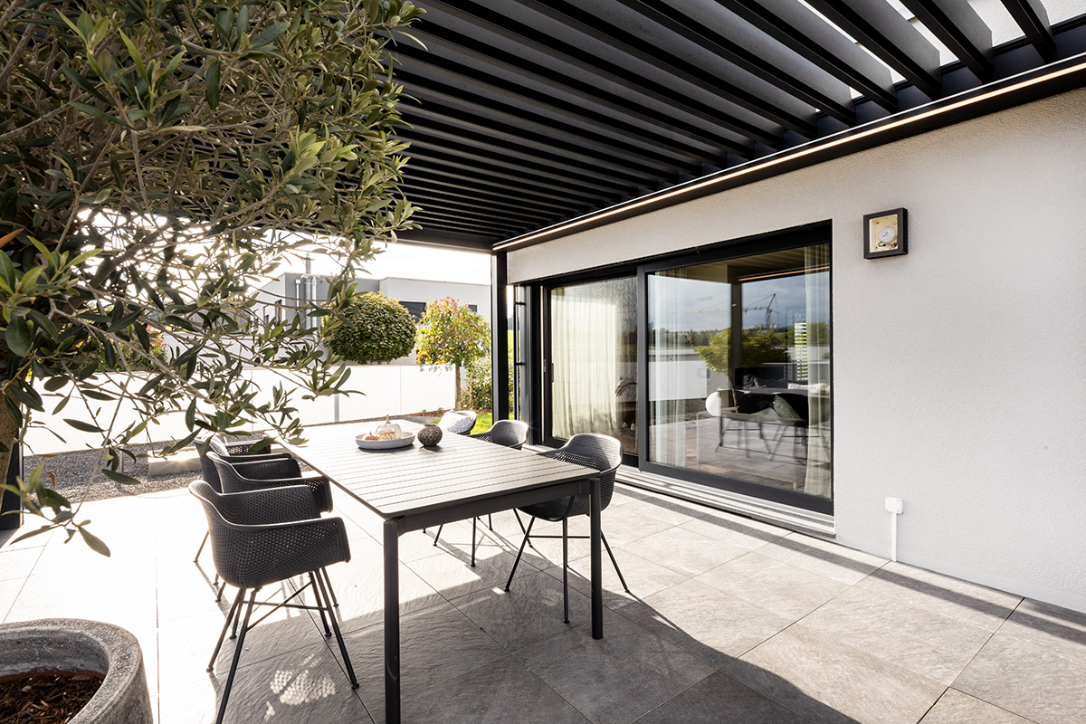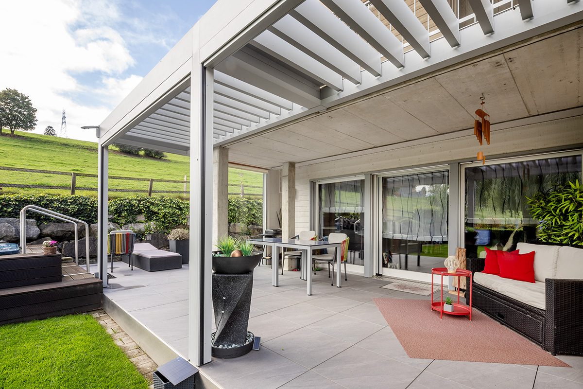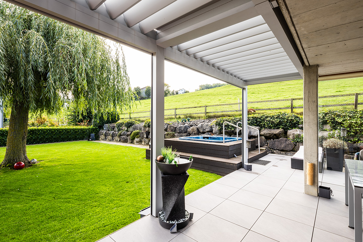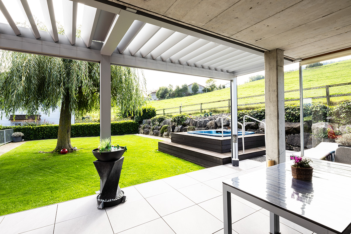 Ihr Zuhause erweitert sich in den Garten, auf die Terrasse – ein Ort, an dem Sie die Natur geniessen können, ohne Kompromisse eingehen zu müssen. Ein Lamellendach verwandelt Ihren Aussenbereich in eine Oase, die perfekt auf Ihre Bedürfnisse abgestimmt ist. Sonne oder Schatten? Frische Luft oder Regenschutz? Sie haben die Wahl.