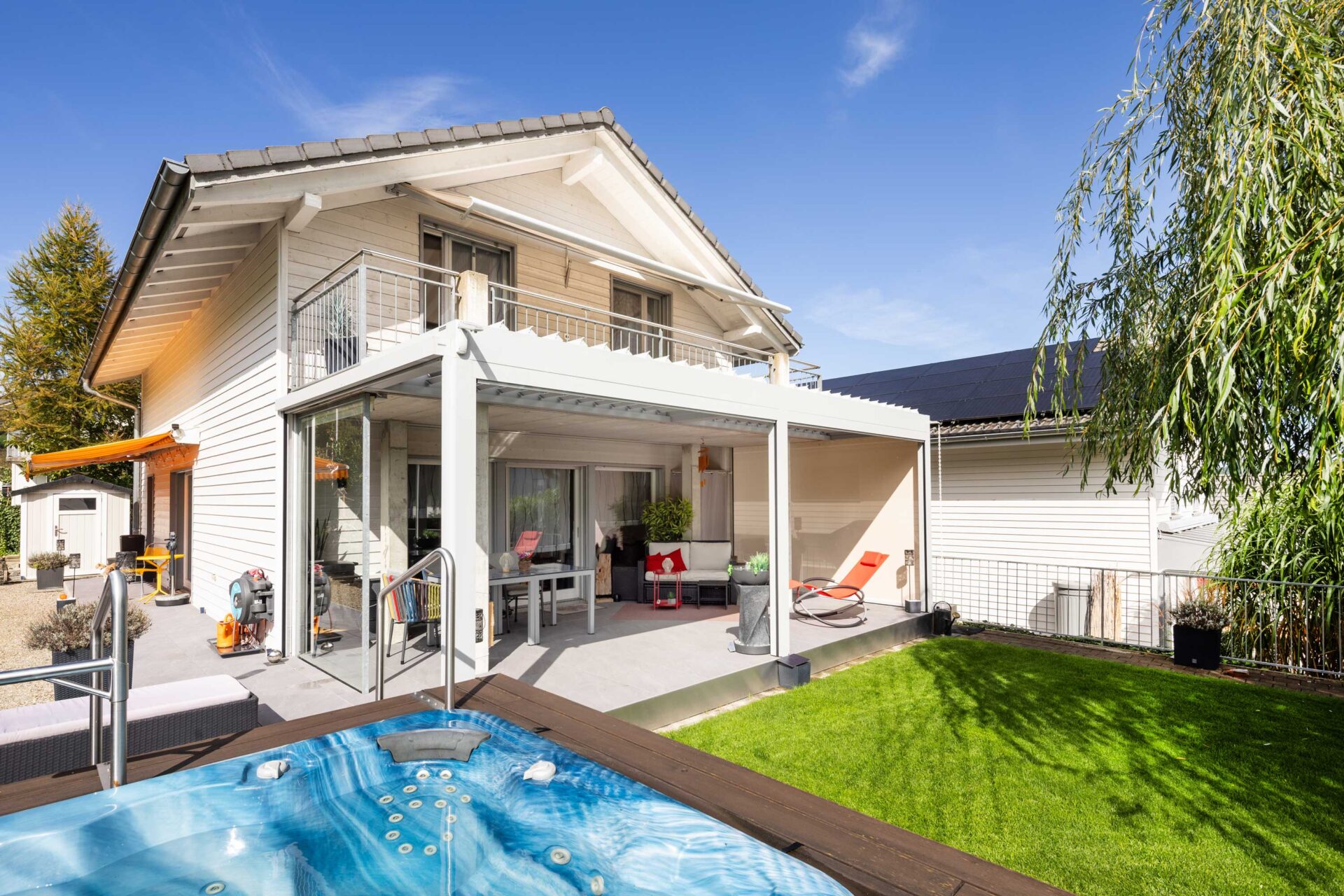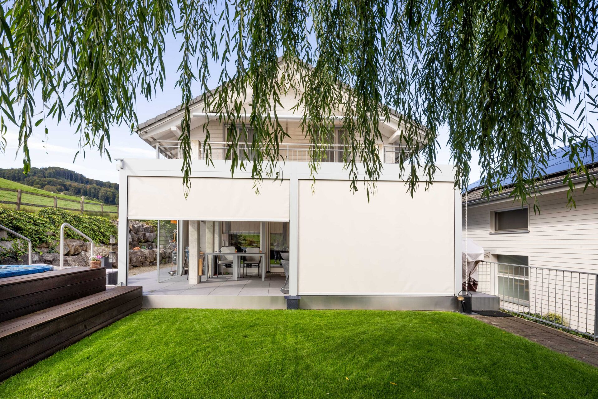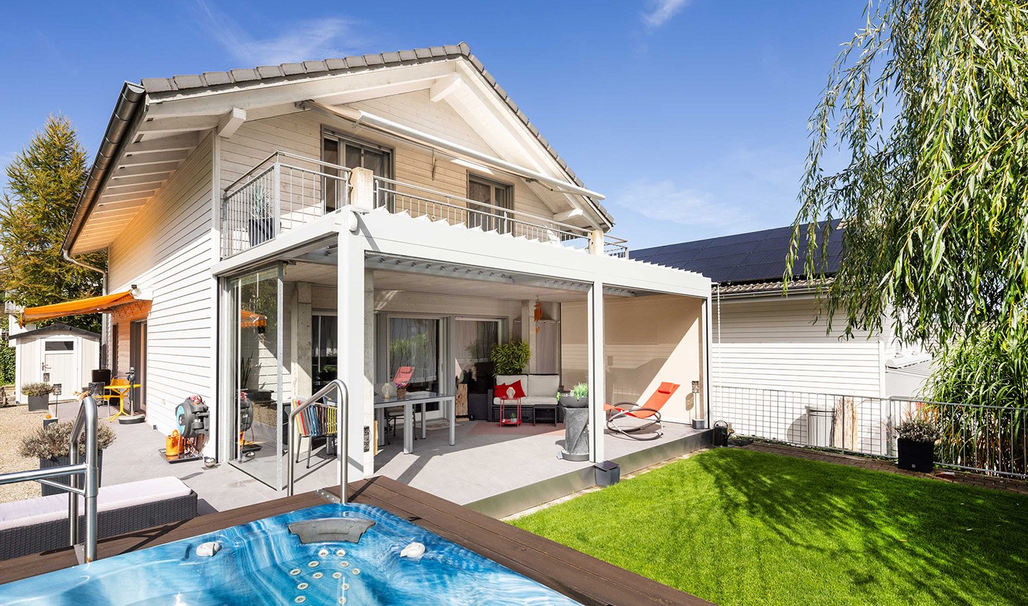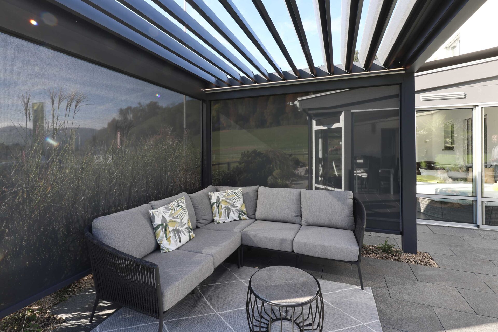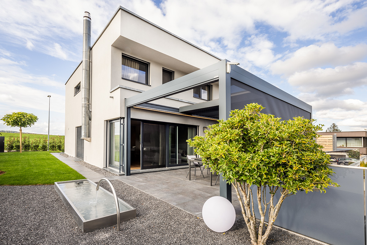 Ihr Zuhause erweitert sich in den Garten, auf die Terrasse – ein Ort, an dem Sie die Natur geniessen können, ohne Kompromisse eingehen zu müssen. Ein Lamellendach verwandelt Ihren Aussenbereich in eine Oase, die perfekt auf Ihre Bedürfnisse abgestimmt ist. Sonne oder Schatten? Frische Luft oder Regenschutz? Sie haben die Wahl.