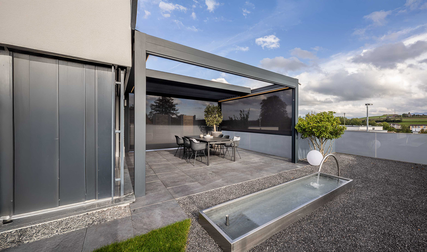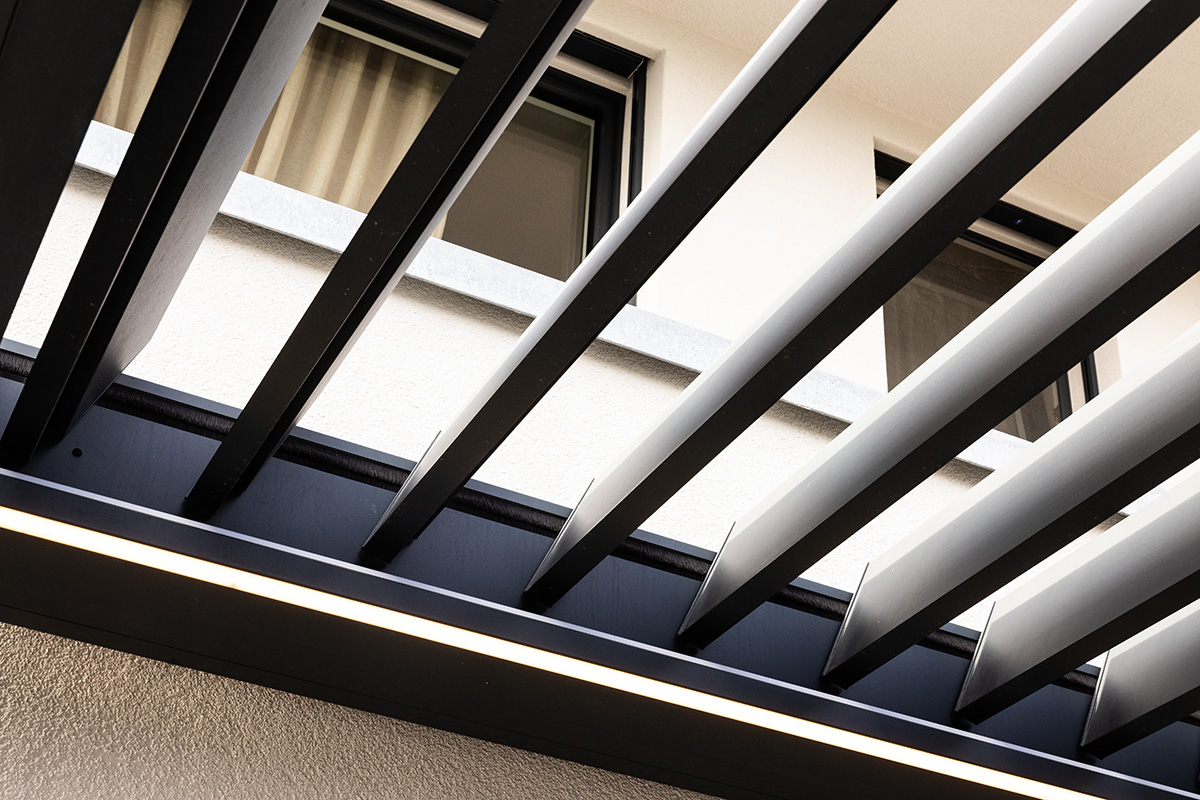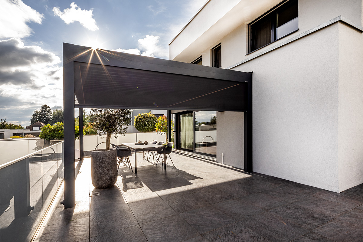 Lamaxa schützt Sie bei Sonne und Regen. Regulieren Sie den Lichteinfall je nach Typ mit den drehbaren oder dreh- und verfahrbaren Lamellen — bis hin zum kompletten Schliessen des Lamellendachs.