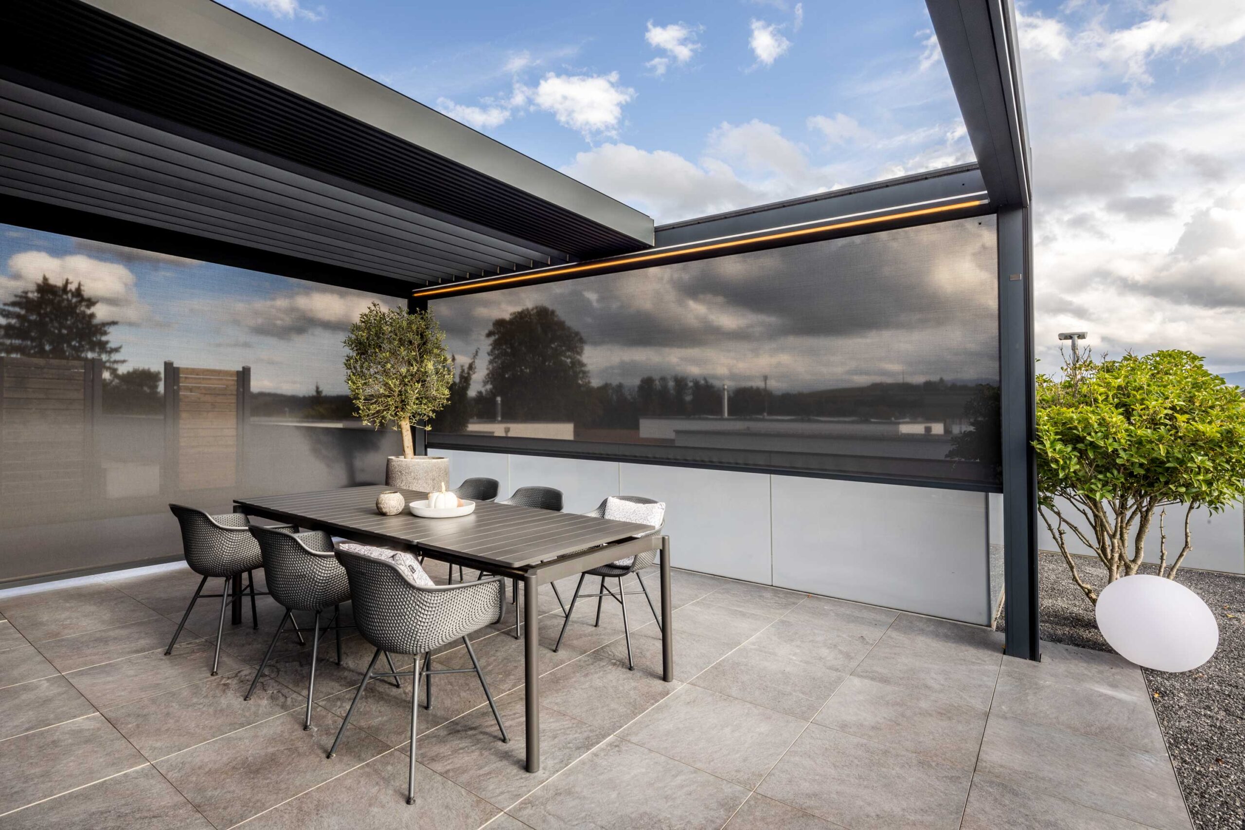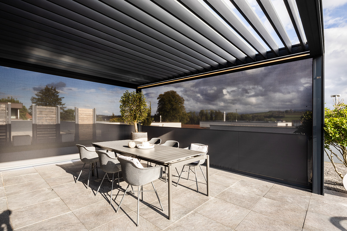 Verbringen Sie Ihre Zeit im Freien. Mit Lamaxa erhalten Sie Schutz bei jeder Witterung. Der Lichteinfall ist je nach Typ mit den drehbaren Lamellen exakt regulierbar — bis hin zum kompletten Schliessen des Lamellendachs.